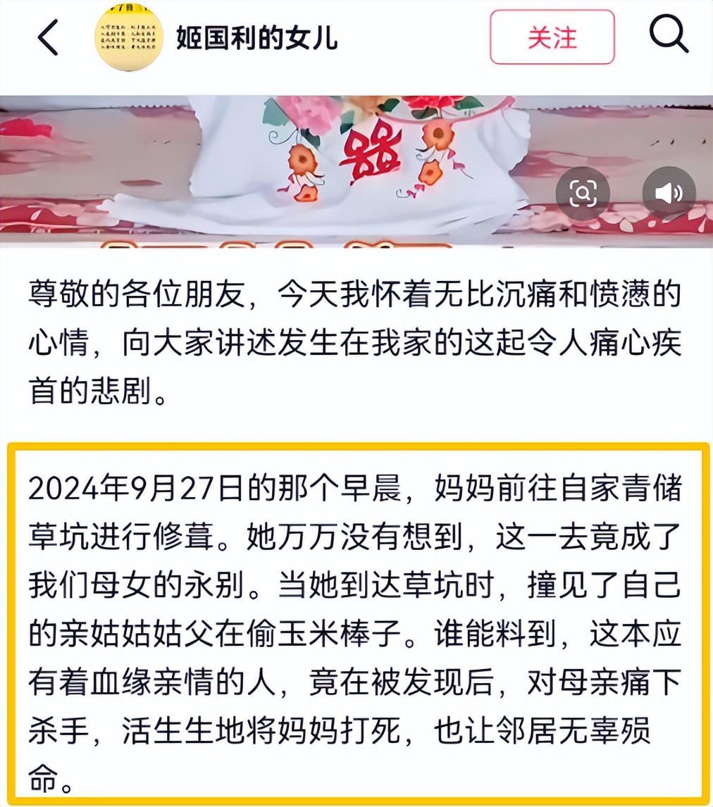 姬某利看到后很生气,因为之前姑姑曾数次偷过她家玉米,碍于亲戚关系,她一直没有戳破。